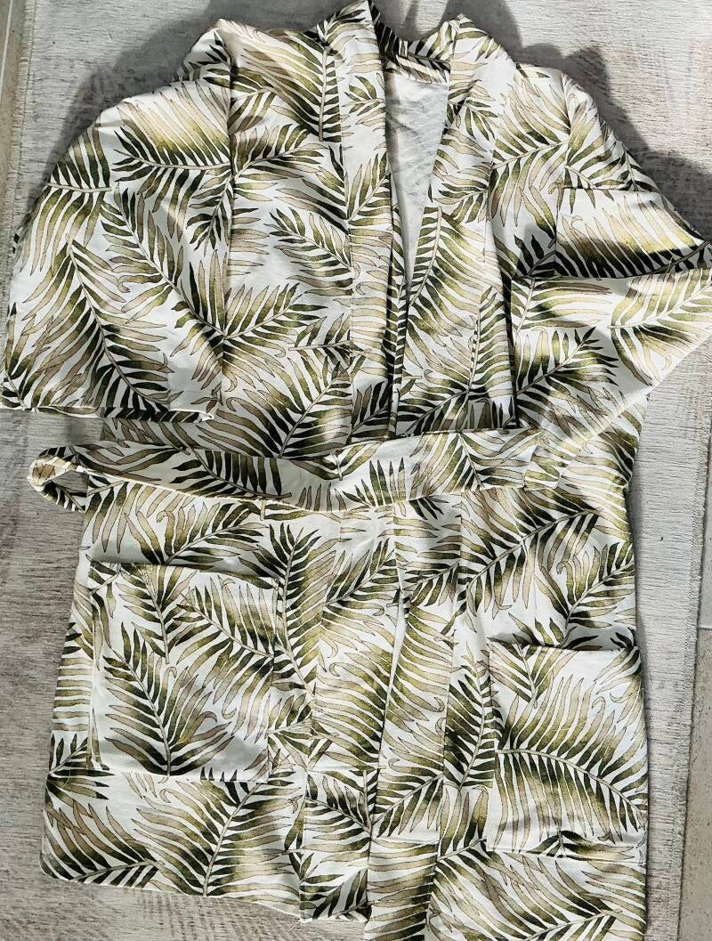 Our latest robe is made from 100% repurposed cotton fabric and constructed entirely by hand in the United States. We focused on high-quality craftsmanship, incorporating details like French seams for durability, structure, and a clean finish inside and out.
